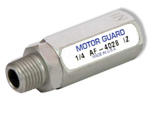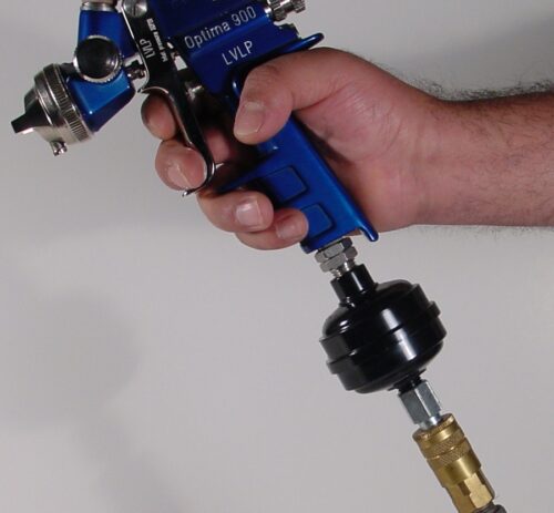 This unique product is the only in-line disposable filter that features a color change indicator, signaling time to change the filter. Attaching directly to the spray gun, the Motor Guard Mini Desiccant Dryer removes all traces of water vapor, aerosols and dirt, providing crucial protection for final blow off of body panels and for all stages of painting including the critical application of clear-coats. The key to the performance of the Motor Guard Mini Desiccant Dryer lies in its unique, patented design. A 5 micron, porous bronze element removes fine dirt particles, an oil-absorbent media removes the smallest traces of oil vapor and a charge of desiccant beads traps airborne moisture delivering air to the spray gun at an incredible -40° dew point. The filter features a clear polycarbonate housing and view ports in the nylon guard allow for easy viewing of the moisture indicating desiccant beads. When the bead color changes completely from dark blue (-40° dew point) to pink (0° dew point), the filter should be replaced. The Motor Guard Mini Desiccant Dryer provides a last line of defense against airborne contaminants that are commonly picked up downstream of wall-mounted filtration units and in the air hose leading to the spray gun.