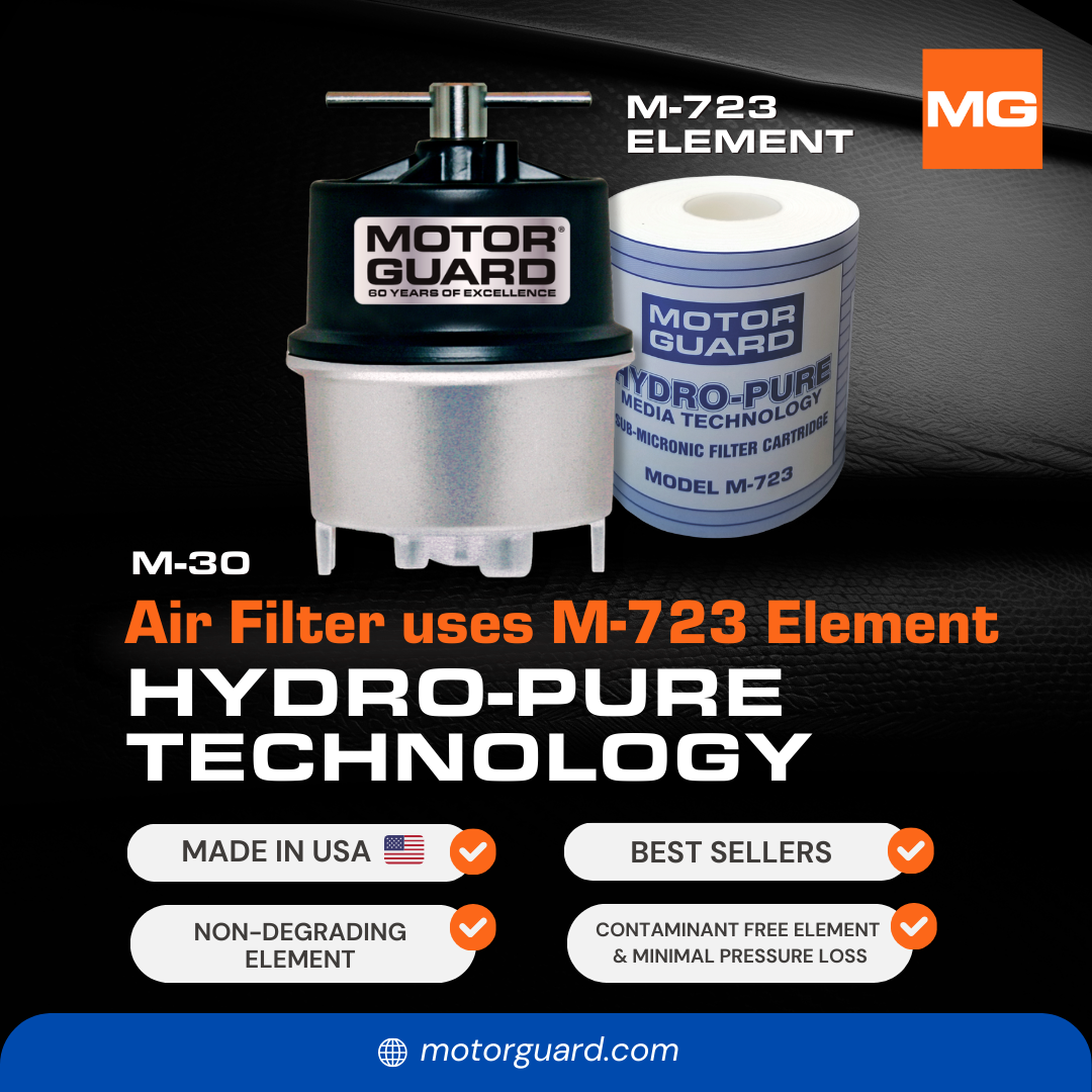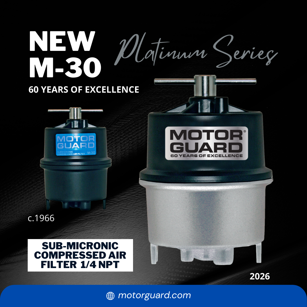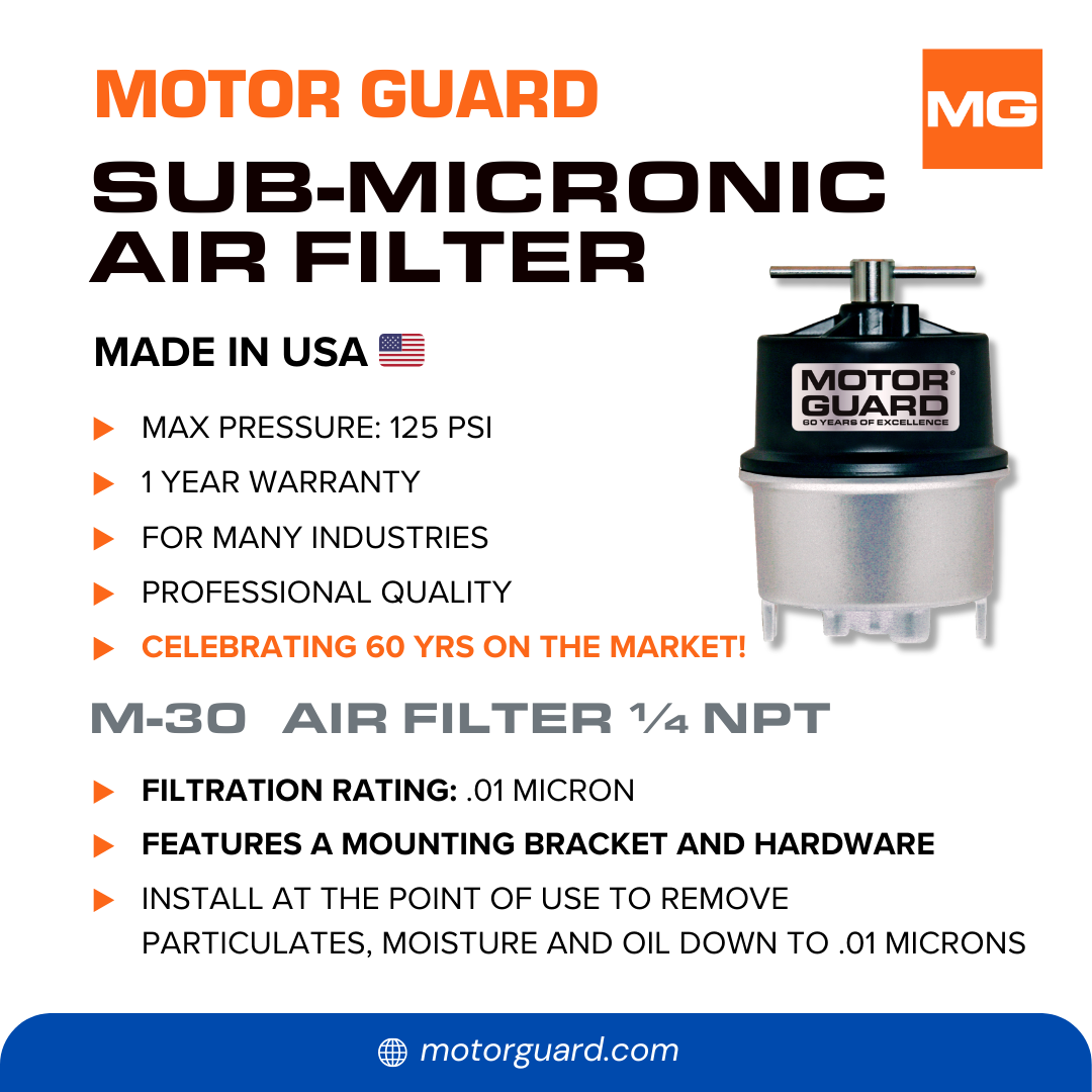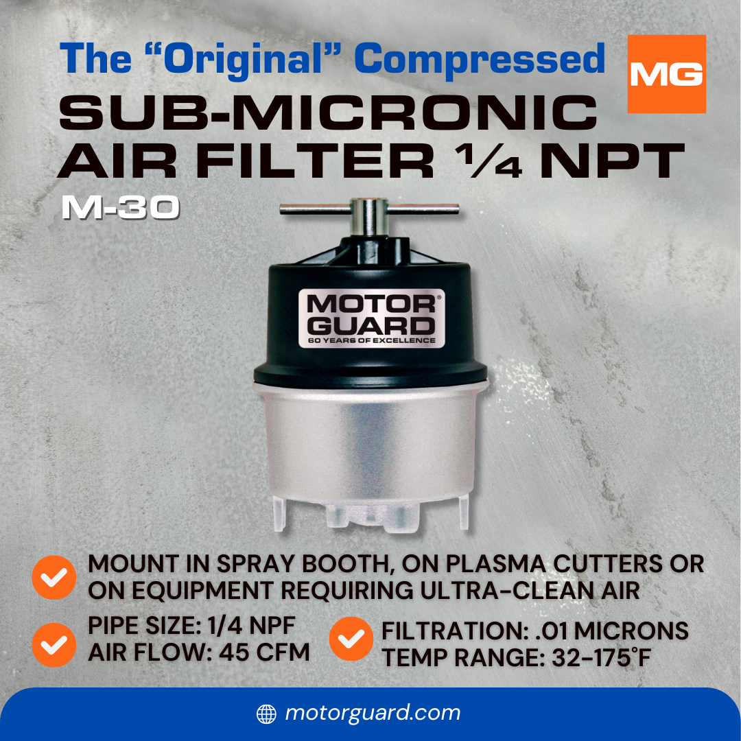 Motor Guard Sub-Micronic Compressed Air Filters are the ultimate defense against damaging, dirty air. Designed for installation at to the point of use, these filters remove particulates, condensed moisture and oil aerosols down to an incredible .01 microns in size. No other filter on the market provides this level of protection combined with a low pressure drop and ease of use. Produced from a propreitaty blend of hydrophilic fibers, the wound element in the Motor Guard filter traps contaminants and absorbs large quantities of moisture and oil. The M-30 model features a mounting bracket and hardware for use with 1/4 inch hose. This unit will mount in spray booths, on plasma cutters or on other equipment requiring ultra-clean air and a flexible connection.